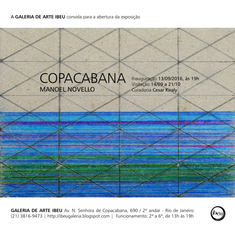 Copacabana reúne seis pinturas de grandes dimensões, fotografias, desenhos e instalação. Com curadoria do crítico de arte Cesar Kiraly, a mostra explicita o diálogo que Manoel Novello estabelece com a cidade que vivencia e aprofunda as relações que o artista cria entre sua pintura, a arquitetura, o espaço urbano do bairro e sua orla marítima.