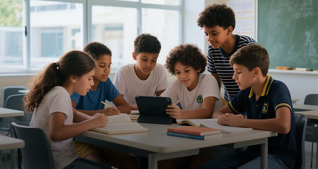 Projetos interdisciplinares do mundo real desenvolvidos em grupos, que estimulam a criatividade e o pensamento crítico.